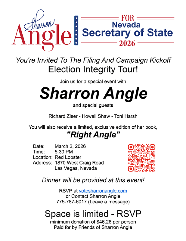 Sharron Angle is campaigning across Nevada to become the next Secretary of State. There are still a few seats left for the Campaign Kickoff Dinner in Las Vegas on March 2 at 5 pm, at Red Lobster In Las Vegas, 1870 West Craig Road. You can click here to get your tickets here!